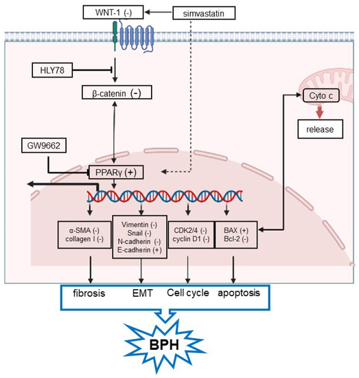 Finally, it is also known that activation of PPARγ could inhibit classical WNT/β-catenin pathway signaling. On the other hand, WNT/β-catenin pathway activation could lead to PPARγ inactivation in many tissues [53]. Canonical WNT signaling is mediated by the interaction of WNT ligands with specific targets, leading to cytosolic β-catenin aggregation and nuclear translocation, whose nuclear activation triggers the stimulation of downstream factors [54]. Subsequently, it could induce several process, such as cell proliferation, differentiation, apoptosis, inflammation, fibrosis, and EMT [55,56,57,58,59]. Importantly, dysregulation of the classical WNT pathway has been observed in most cancers and other human diseases including BPH [56,58].