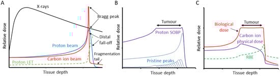 Comparison of tissue penetrance relative to dose of X-rays, PBT and CIRT. (A) Tissue-depth-relative dose distribution of X-rays, and pristine proton and carbon ion beams, along with the variation of dose averaged LET for protons varying from ~1 keV/μm to ~17 keV/μm (the LET of carbon ions follows a similar trend, reaching a maximum of ~300–400 keV/μm). (B) The use of multiple pristine proton beams of different energies to give a produce a SOBP that generates a relatively uniform dose distribution across a tumour volume. (C) The use of multiple carbon ion beams to produce a SOBP, but taking into account the calculated RBE and varying the physical dose to give a relatively uniform biological dose across the tumour.