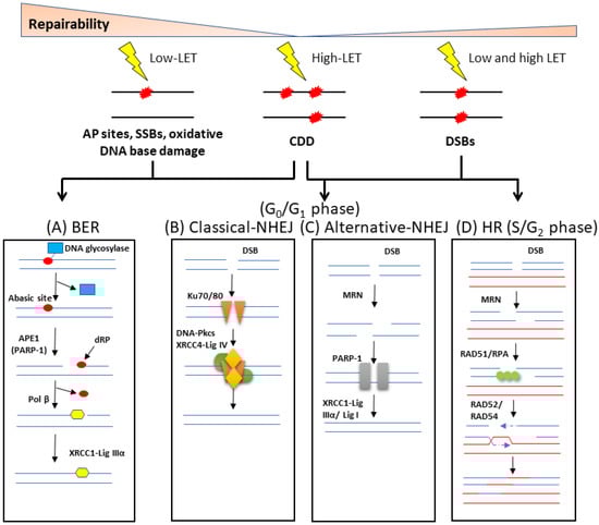In terms of the repair of CDD, this very much depends on the nature and complexity of the damage, and particularly the LET of the IR being examined. It can be assumed that complex SSBs will largely require proteins involved in BER if the individual DNA lesions are repaired sequentially. However, the close proximity of the lesions making up these non-DSB CDD sites can significantly impair the repair of the individual lesions, increasing their persistence and the probability that they are still present during replication [20]. Complex DSBs, on the other hand, are likely to involve enzymes across all the repair pathways, BER, NHEJ and HR. Current evidence of the precise enzymes and mechanisms involved in the signalling and repair of CDD is covered in more detail in Section 3.3.