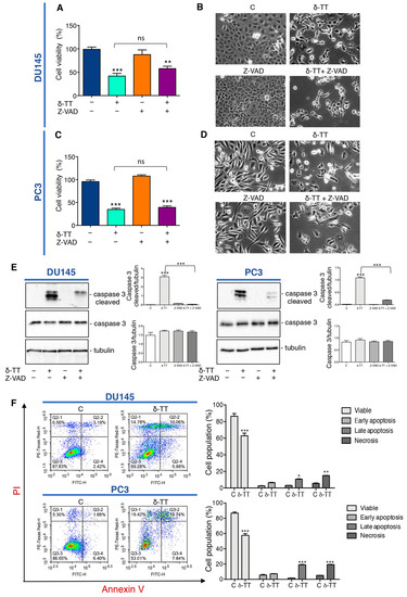 We previously demonstrated that δ-TT induces cytotoxicity in CRPC cell lines triggering apoptosis through activation of ER stress and autophagy, and the abrogation of apoptosis by the pan-caspase inhibitor Z-VAD-FMK (Z-VAD) significantly, but not completely, reverted the cytotoxic effect of δ-TT (15 μg/mL) [34]. Here we analyzed the effect of a higher dose of δ-TT (20 μg/mL) on cellular viability of DU145 and PC3 cell lines in the presence of Z-VAD. The results summarized in Figure 1A,C show that this dose of δ-TT significantly induces a cytotoxic effect in both cell lines, but surprisingly the treatment with Z-VAD does not significantly reverse the δ-TT cytotoxicity. In addition, as shown in the Figure 1B,D, DU145 and PC3 cells treated with δ-TT developed morphological changes (small vacuoles and rounded shape) compared with the untreated cells and Z-VAD in combination with δ-TT, which did not significantly counteract the phenotype δ-TT induced. However, as shown Figure 1E, the increase of caspase 3 cleaved induced by δ-TT, is significantly reversed by Z-VAD, revealing that apoptosis is involved in δ-TT cytotoxicity. Globally these results could suggest that, when apoptosis was chemically inhibited, this dose of δ-TT exerted cytotoxicity triggering another type of cell death. Concurrently, FACS analysis by Annexin-FITC/Propidium Iodide (PI) double staining showed that the treatment with δ-TT (20 μg/mL) for 48 h induced an accumulation of cells not only in late apoptosis, but also in necrosis (14.78% in DU145 and 19.42% in PC3 cells) in respect to control cells (6.56% in DU145 and 5.30% in PC3 cells) indicating that another type of cell death other than apoptosis occurred (Figure 1F). These results demonstrate that the cytotoxic action of δ-TT is not only attributable to apoptosis activation, but a necrotic phenomenon could also be involved.