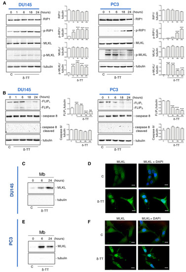 The results obtained confirmed that δ-TT actives necroptotic machinery promoting RIP1 and MLKL phosphorylation and MLKL translocation into the membranes, as well as decreasing FLIPL expression by preventing caspase-8 activation in both DU145 and PC3 cells. In addition, we have shown that δ-TT-induced necroptosis contributes to cell death. The obtained results demonstrate for the first time that the δ-TT can activate an alternative form of cell death, which can be effective when tumor cells undergo molecular modifications that alter the ability to respond to apoptotic stimuli.