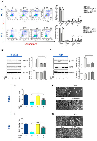 To analyze the impact of necroptosis on the antitumoral activity of δ-TT, we used Necrostatin-1 (Nec), a RIP1 kinase inhibitor widely used to inhibit necroptosis. At first, we performed flow cytometry analysis with Annexin V-FITC/PI double staining in DU145 and PC3 cells co-treated with δ-TT (20 μg/mL, 48 h) and Nec (50 μM) highlighting that necroptosis inhibitor counteracted the percentage of the cells in necrosis and late apoptosis (Figure 3A). Furthermore, we also analyzed the effect of Nec on RIP1 expression after δ-TT treatment. Figure 3B,C shows that Nec counteracted the δ-TT-induced RIP1 phosphorylation in both cell lines inhibiting the activation of RIP1-dependent necroptotic process. Based on the above results, we performed an MTT assay comparing treatment with δ-TT with the combination of δ-TT and Nec. The results obtained in both DU145 and PC3 cells demonstrated that the cytotoxic effect of δ-TT was counteracted by Nec (Figure 3D,F). Furthermore, the morphological analysis by phase-contrast microscopy confirmed the ability of Nec to revert the cellular alterations induced by δ-TT in DU145 (Figure 3E) and PC3 cells (Figure 3G).