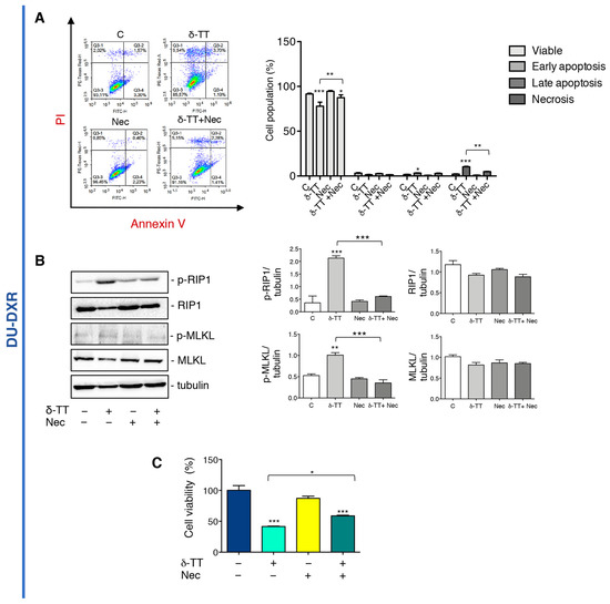 To further investigate if δ-TT-induced necrosis in DU-DXR cells could be necroptosis, cells were incubated with Nec in association with δ-TT. The flow cytometry analysis confirms that the number of cells in δ-TT-induced necrosis were reduced in the presence of Nec (Figure 5A). Moreover, WB experiments showed that δ-TT increases both RIP1 and MLKL phosphorylation, whereas Nec markedly counteracts these events (Figure 5B). This result confirms that even in DTX-resistant cells, δ-TT induces RIP1-dependent necroptosis. In addition, MTT analysis showed that δ-TT cytotoxicity was significantly counteracted by Nec (Figure 5C) demonstrating that in DU-DXR cells δ-TT treatment induces cell death through the activation of necroptosis.