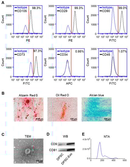 Identification of human DPSCs and exosomes. (A) The flow cytometry analysis showed that the DPSCs highly expressed CD105, CD29, CD90, and CD73, while CD34 and CD45 were almost not expressed in the DPSCs. Red line: the threshold of positive cells. (B) Alizarin Red S, Oil Red O, and Alcian Blue staining showed that the DPSCs had the capacity for multi-lineage differentiation after osteogenic, adipogenic, and chondrogenic induction, respectively. (C) Transmission electron microscope image of DPSC-Exos. (D) The Western blot results showed high expression of exosome-specific markers CD9 and CD81 in the DPSC-Exos compared with the DPSCs. (E) The particle size distribution of DPSC-Exos was analyzed by NanoSight.