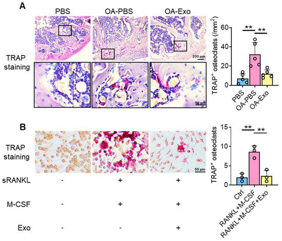 DPSC-Exos inhibited osteoclast activation in the subchondral bone. (A) Representative images of osteoclasts in the subchondral bone by TRAP staining. Data are presented by mean ± SD. ** p < 0.01; n = 5. (B) Representative images of RAW 264.7 cells by TRAP staining after osteoclast induction. The data were collected from three independent samples and are presented by mean ± SD. ** p < 0.01.