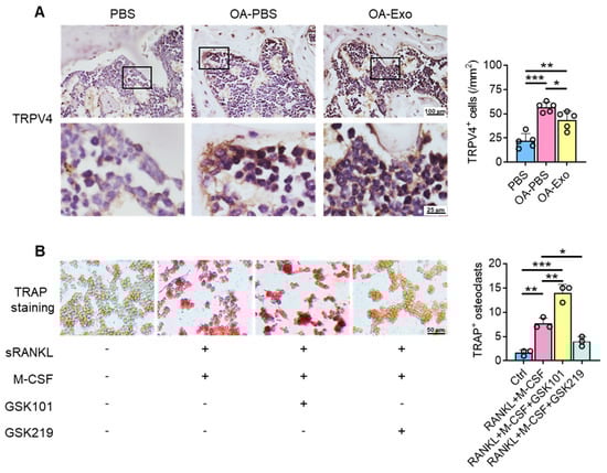 The progression of knee OA is often accompanied by abnormal resorption and repair of the subchondral bone [], and the occurrence of bone sclerosis and osteophytes is closely related to the prognosis [,]. Previous studies mainly paid attention to the therapeutic effects on cartilage degradation and chondrocyte metabolism, while the present study has demonstrated the direct influence of MSC-exosomes (MSC-Exos) on osteoclast activation. Our results have shown that an MIA injection manifested itself in typical radiographic and pathological changes, and DPSC-Exos effectively regulated the bone metabolism via TRPV4 in a progressive OA model. Meanwhile, Hinata et al. [] claimed the improvement of OA-related functional loss and pain after intra-articular injection of GSK2193874. Therefore, the topical administration of a TRPV4 inhibitor may provide an alternative to improve OA-related subchondral bone remodeling.