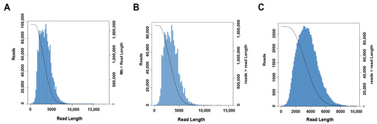 Length distributions of PacBio SMRT sequencing. (A) Number and length distributions of 1,630,747 CCS sequences. (B) Number and length distributions of 1,472,058 FLNC sequences. (C) Number and length distributions of 94,981 consistent sequence. The blue area is the number of reads at a certain length (corresponding to the left abscissa value), the black line corresponds to the ordinate on the right and is the number of reads greater than a certain length (corresponding to the right abscissa value).