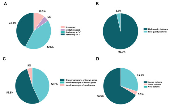 The 91,477 high-quality (HQ) isoforms were mapped to the reference genome of H. armiger (ncbi_GCF_001890085.1). Based on the mapping results, these reads can be classified into four groups: Unmapped, Multiple mapped, Reads map to “+”, and Reads map to “−”. A total of 81,871 (89.50%) reads were mapped to the reference genome, including 77,214 (84.41%) uniquely mapped reads and 4657 (5.09%) multiple mapped reads. A total of 38,948 (42.58%) reads were mapped to Reads map to ‘+’ and 38,266 (41.83%) reads were mapped to Reads map to ‘−’ (Figure 3A, Table S1). For the subsequent analysis, we only used HQ isoforms (Figure 3B, Table S1).