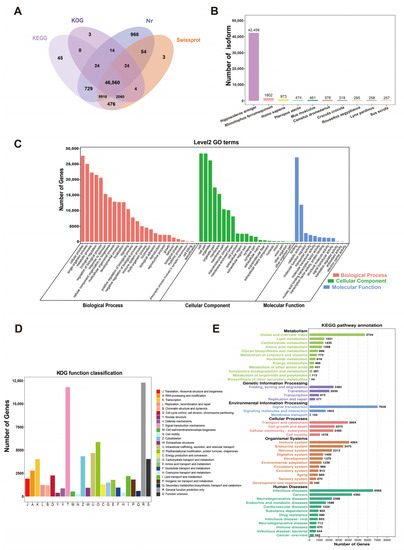 Function annotation of all isoforms. (A) Venn diagram of annotations in KEGG, KOG, NR, and SwissProt databases. (B) Nr Homologous species distribution diagram of all isoforms. (C) Distribution of GO terms for all annotated isoforms in biological process, cellular component, and molecular function. (D) KOG enrichment of all isoforms. (E) KEGG pathways enrichment of all isoforms.