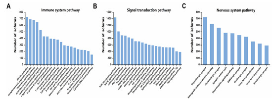 Participation of isoforms in various pathways. (A) The proportion of isoforms annotated in the Immune system pathway. (B) The proportion of isoforms annotated in the signal transduction pathway. (C) The proportion of isoforms annotated in the nervous system pathway.