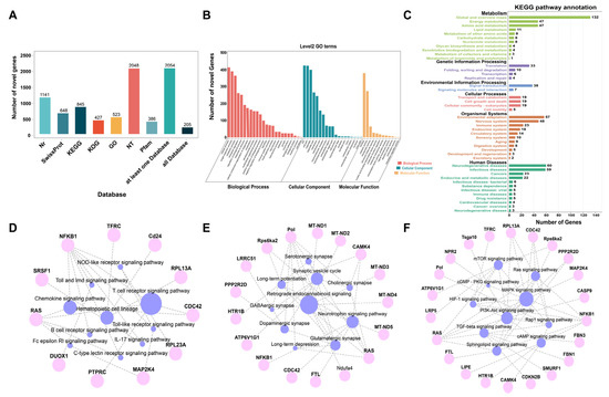 Basic annotation information of novel genes. (A) Function annotation of novel genes in all databases. (B) Distribution of GO terms for all annotated novel genes in biological process, cellular component, and molecular function. (C) KEGG pathways of novel genes. (D) Network diagram of Immune system pathways and genes. (E) Network diagram of Nervous system pathways and genes. (F) Network diagram of Signal transduction pathways and genes.