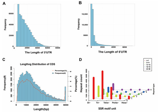 Prediction of the coding sequences and SSR types. (A) The length of 3′ UTR. (B) The length of 5′ UTR. (C) Length distribution of CDSs. (D) Distribution map of SSR types.
