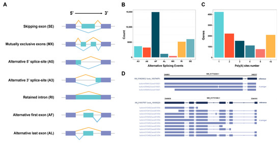 PacBio sequencing also promotes the study of APA sites, and we examined the 3′ end of the isoforms sequenced by PacBio SMRT to identify the APA sites of the genes accurately in H. armiger. A total of 66,010 poly (A) sites were identified in 12,029 genes identified, 4237 genes showed one poly (A) sites, and 2105 genes contained at least five poly (A) sites. On average, each gene contained 1.04 poly (A) sites (Figure 8C).
