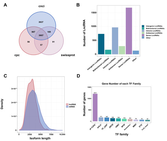 LncRNAs play an essential role in regulating gene expression in most eukaryotes. We identified 86,304,937, and 4274 isoforms by CNCI, CPC, and Swissprot, respectively. Combining the results of three methods, a total of 3957 lncRNAs were predicted, including 2542 new lncRNAs (64.2%) and 1415 novel lncRNAs (35.8%) (Figure 9A). In addition, we classified new LncRNAs into five major categories based on their position on the genome relative to protein-coding genes: Intergenic LncRNAs, Bidirectional LncRNAs, Intronic LncRNAs, Antisense LncRNAs, and Sense overlapping LncRNAs (Figure 9B). Comparing the density of isoforms length distribution of lncRNAs and original mRNAs, it was found that more lncRNAs between 2500 nt and 3500 nt in length than mRNAs, with the longest predicted lncRNA not exceeding 10,000 nt (Figure 9C).