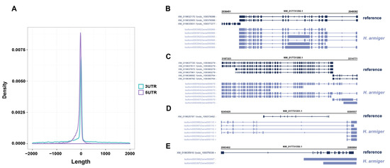 To optimize the gene structure of the H. armiger reference genome, each isoform was compared with the existing gene model annotated by ncbi_GCF_001890085.1. We performed statistical analysis of 5′ UTR and 3′ UTR lengthening or shortening for isoforms classified as known. The frequency distribution of UTR length changes is shown in Figure 10A. Then, we compared the isoforms classified as new with the reference genes, the isoforms in Figure 10B,C (Isoform000390, Isoform000391, Isoform000392, Isoform000393, Isoform000394, Isoform000395 and Isoform000402, Isoform000403, Isoform000404, Isoform000405, Isoform000406, Isoform000407, Isoform000408) span two or more reference genes (XM_019632170.1 (NRBP1), XM_019632905.1 (NRBP1), XM_019633931.1 (KRTCAP3) and XM_019637720.1 (CAD), XM_019637811.1 (CAD), XM_019637872.1 (CAD), XM_019637961.1 (CAD), XM_019638692.1 (ATRAID), and XM_019638782.1 (ATRAID)). These isoforms are known as Span isoforms.