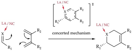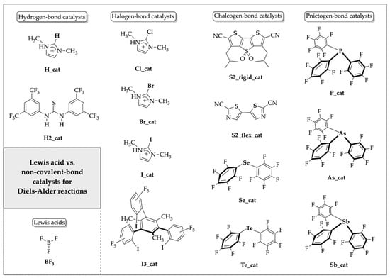 Non-covalent catalysis can also be obtained via interaction with the σ holes of halogen-, chalcogen-, and pnictogen-based catalysts [9]. The σ hole is a region of positive potential, found along the axis of a covalent bond between, for example, the chalcogen atom and the remaining structure. It was only very recently that these catalysts gained interest, and the exact driving force behind the catalysis has yet to be identified. The number of σ holes and their accessibility differ for halogens, chalcogens, and pnictogens, and their strength will increase when going from left to right in the periodic table [9]. Both computationally and experimentally [10,11,12,13], halogen catalysts of different nature were shown to accelerate DA reactions by lowering the activation barrier up to 15 kcal mol−1 [14]. The effectiveness of the catalyst was related to the strength of the formed non-covalent bond and increased going from Cl to I species [15]. Chalcogen catalysts were shown to increase the reaction rate of the DA reaction [16], reaching a factor well beyond 1000 for a reaction between quinolines and imines [17]. Computational studies predicted the pnictogen catalysts to be even more active than halogen and chalcogen catalysts [18,19] for DA reactions with α,β-unsaturated ketones, while the opposite was shown for 1,3 butadiene and methyl acrylate DA reactions [20].