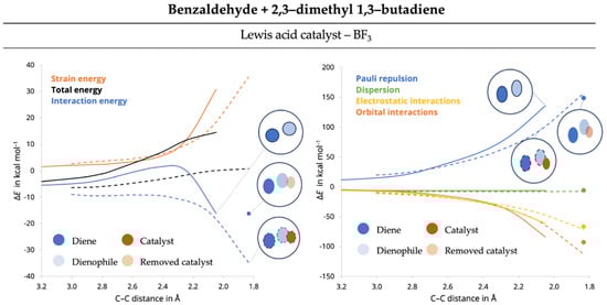 In the activation strain model (ASM) of reactivity, the potential energy along the intrinsic reaction coordinate, obtained via an IRC calculation, is decomposed into a destabilizing strain energy—associated with the deformation of the reagents from their equilibrium structure to the geometry they adapt when they start to interact—and an interaction energy that can be further broken down into Pauli repulsion energy, and electrostatic, orbital, and dispersion interaction terms. When considering Diels–Alder reactions, one usually projects the intrinsic reaction coordinate onto the bond length of one of the formed DA bonds, a geometrical parameter that clearly defines the evolution of the DA reaction and that can be easily measured as such, allowing for the comparison of uncatalyzed and catalyzed reactions. For reaction 1 between benzaldehyde and 2,3-dimethyl 1,3-butadiene, we opt for the C⋯C bond distance and not the O⋯C bond distance since the former one becomes markedly shorter upon catalysis. In Figure 3, the ASM and accompanying EDA analyses are plotted for the uncatalyzed and BF3-catalyzed BEN + DMB reactions. Note that for all ASM and EDA analyses to follow, fragment 1 consists of the dienophile, in the absence or presence of the catalyst, and fragment 2 is the diene.
