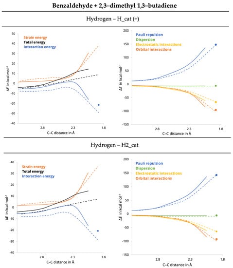 Next to the often-important electrostatics, polarization, charge-transfer, dispersion interactions, and strain energy can also play a critical role. One way to quantitatively analyze their influence is to partition the complexation energy into additive contributions associated with the different stabilizing and destabilizing factors. In this study, we have used the Ziegler-Rauk-type energy decomposition analysis as already highlighted in the introduction. Table 2 lists the different energy components for the formation of the encounter complexes between benzaldehyde and the set of 13 potential catalysts, now based on the PBE/TZ2P electronic energies. In the Supplementary Materials, Tables S3 and S4 report the values for the other two reactions.