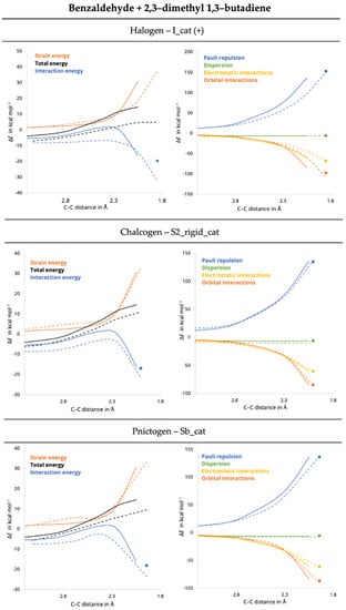 ASM (left) and EDA (right) analysis of the uncatalyzed and halogen-, chalcogen-, and pnictogen-bond-catalyzed reactions between benzaldehyde and 2,3-dimethyl 1,3-butadiene. The solid line represents the reaction without the catalyst, and the dashed line represents the reaction with the catalyst. The dots represent the values for the transition-state geometry of the catalyzed reaction with the catalyst deleted.