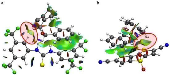 The systems were further analyzed using molecular electrostatic potential (MEP) maps and non-covalent interaction index (NCI) plots [39] at the M06-2X-D3/cc-pVDZ(-PP) level of theory. The Ziegler-Rauk-type energy decomposition analysis (EDA) [40,41,42], the activation strain model (ASM) [43] analyses using the PyFrag 2019 (version 0.1.0) software [44], and the natural orbitals for chemical valence (NOCV) [45] analysis of the Gaussian16-optimized structures were computed using the PBE/TZ2P (small core) level of theory [46,47,48] in combination with the dispersion correction Grimme’s D3 method, using the Amsterdam Modeling Suite (AMS) [49]. Relativistic effects were considered by using the zeroth-order regular approximation (ZORA) [50]. The levels of theory used for the quantum-chemical analysis tools are based on previous work in our group [27,51,52], in which non-covalent interactions were analyzed in a similar fashion as the current study. In particular, the PBE functional was selected because it is as good as dispersion-correction free, allowing for a correct quantification of the dispersion energy term in EDA via Grimme’s D3 correction.