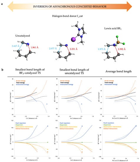 (a) Bond distances of the two bonds under formation in the transition-state geometries of the uncatalyzed, I_cat catalyzed, and BF3-catalyzed Diels–Alder reactions between methylene imine and 1,3-butadiene, and their connection to the asynchronous concerted behavior of the reactions. (b) ASM/EDA analyses of uncatalyzed and BF3-catalyzed reactions along the reaction coordinate projected onto the C–C bond length, the shortest bond being formed in the BF3-catalyzed TS geometry (left); the N–C bond length, the shortest bond being formed in the uncatalyzed TS geometry (middle); and the average bond distance (right).