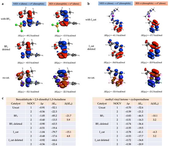 Contour plots of NOCV deformation densities (red for depletion, blue for accumulation) and associated orbital energies ΔE(ρ) for the normal-electron-demand (NED) and inverse-electron-demand (IED) interactions of (a) the BF3-catalyzed and uncatalyzed benzaldehyde + 2,3-dimethyl 1,3-butadiene Diels–Alder reaction, and of (b) the I_cat-catalyzed and uncatalyzed methyl vinyl ketone + cyclopentadiene Diels–Alder reaction. (c) NOCV deformation densities Δρ and associated orbital energies ΔEoi, with the difference between catalyzed and catalyst-deleted values for NED and IED interactions highlighted in orange.