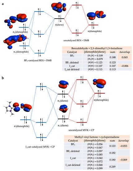 Molecular orbital diagrams showing the occupied π-MOs of diene and dienophile responsible for the main part of the Pauli repulsion energy term, and their occupied-occupied MO overlap values. (a) Catalyzed and catalyst-deleted benzaldehyde + 2,3-dimethyl 1,3-butadiene Diels–Alder reaction; (b) catalyzed and catalyst-deleted methyl vinyl ketone + cyclopentadiene Diels–Alder reaction.