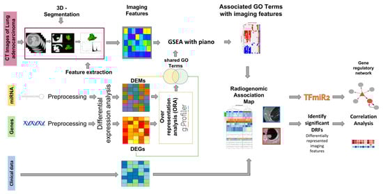 Radiogenomic approaches combine radiological images with underlying molecular information to reveal possible links between these tumor phenotypes and the underlying biology []. Biologically plausible associations between gene expression, miRNA expression, and image features could have a clinical context, such as early prediction of appropriate treatments, and a positive impact on overall survival.