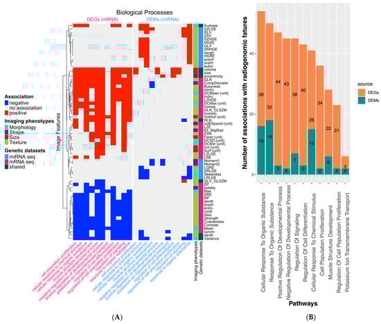Visualization of the significant associations between the GO BP terms. (A) The Piano results of common “biological process” terms (n = 11) from the ORA of DEGs (pink-colored column) and DEMs (blue-colored column) are visualized (considering only image features with at least two negative or positive associations in the dataset). Image features in rows are clustered to reveal a different association pattern in the two transcriptomic profiles (DEGs and DEMs). The annotation column “Imaging phenotypes” reflects the assignment of image features to their group. The “Genetic dataset” legend characterizes an image feature if it was exclusively associated with the terms of gene expression (RNAseq, DEGs), miRNA expression (miRNAseq, DEMs), or within both datasets (shared). (B) The impact of the selected 11 GO terms is illustrated as a bar plot, where the number of significant associations between any image feature and the GO terms is split into DEGs and DEMs. The GO term with the most associations based on the GSEA with Piano is a cellular response to organic substances.