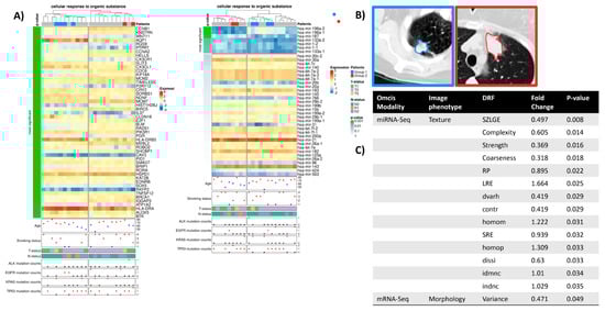(A) Radiogenomic association map of the GO term “cellular response to organic substance”. The clustered rows are ordered by their p-value calculated using a t-test between the two patient clusters. The first 50 genes/miRNAs are visualized. The gene expression-based RAM results from clustering 794 genes, of which 246 have a p < 0.05 (31%). The miRNA-based RAM showcases 7 miRNAs with a p < 0.05 out of 39 miRNAs used for clustering (18%). In addition, clinical information, tumor stage, and mutation frequency of common lung cancer driver genes are displayed. Smoking status was defined as follows: 1-lifelong non-smoker, 2-current smoker, 3-current reformed smoker for more than 15 years, and 4-current reformed smoker for less than 15 years. (B) Two exemplary contrast-enhanced CT images (level-600, window 1500) are presented on the right. (C) Table showing the identified DRFs and their significant association with the miRNA-Seq results of the GO term.