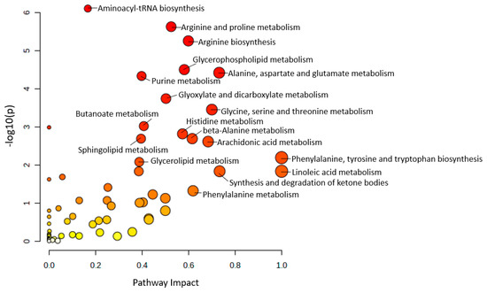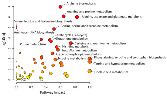 The metabolic pathways were represented as circles according to their scores from enrichment (y-axis) and topology analyses (pathway impact, x-axis). Darker circle colors indicated more significant changes in metabolites in the corresponding pathway. The size of the circle corresponds to the pathway impact score and was correlated with the centrality of the involved metabolites.