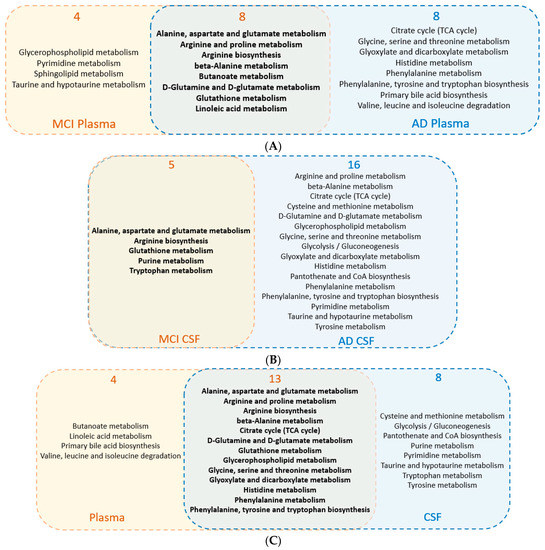 We next used the combined (MCI + AD) altered metabolites found in plasma and CSF samples to understand important pathways in common between these two sample matrices. As shown in Figure 2C, a total of 13 pathways were shared between the plasma and CSF samples. Details of pathway information are presented in Supplementary Table S2.