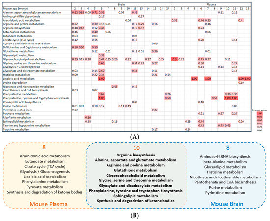 For all the altered metabolites from the 35 mouse studies among different ages (2 months–24 months) in brain and plasma samples, when comparing to the control group, 13 main metabolic pathways were found with a p-value less than 0.05 and an impact value greater than 0.5 (Figure 3), including phenylalanine, tyrosine and tryptophan biosynthesis, linoleic acid metabolism, synthesis and degradation of ketone bodies, alanine, aspartate and glutamate metabolism, glycine, serine and threonine metabolism, arachidonic acid metabolism, phenylalanine metabolism, beta-alanine metabolism, arginine biosynthesis, glycerophospholipid metabolism, histidine metabolism, arginine and proline metabolism, and glyoxylate and dicarboxylate metabolism. Details of pathway information are presented in Supplementary Table S3.