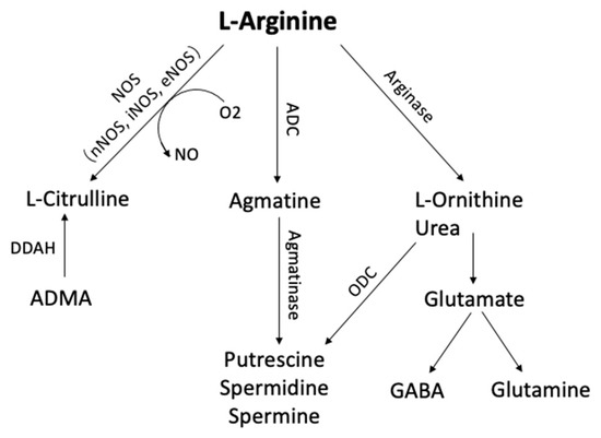 L-arginine is a semi-essential amino acid that can be metabolized to form a number of bioactive molecules [167] (Figure 5). It is synthesized from proline or glutamate, with the ultimate synthetic step catalyzed by argininosuccinate lyase [168]. L-arginine can be metabolized by arginases, nitric oxide synthases (NOS), and possibly also by arginine decarboxylase (ADC), resulting ultimately in the production of agmatine, ornithine, nitric oxide (NO), or urea [168]. The expression of several of these enzymes can be regulated at transcriptional and translational levels by changes in the concentration of L-arginine itself [169].