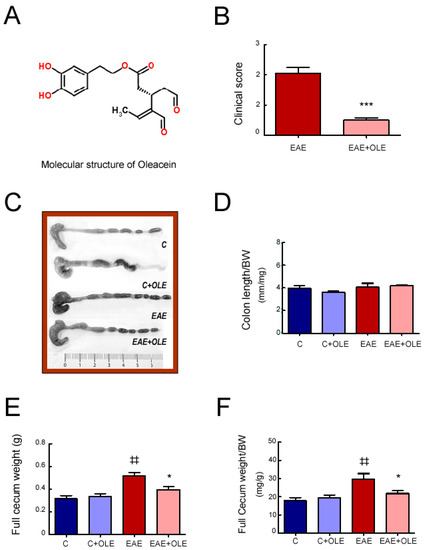 Effect of OLE treatment on colon length and cecal parameters in EAE mice. (A) Schematic representation of OLE; (B) Maximal scores; (C) Representative image of colons; (D) colon length/body weight (BW) ratio; (E) full cecum weight; (F) cecal index: full cecum weight/body weight (BW) ratio. Results were expressed as the mean ± SEM, n = 5–7 per group. ‡‡ p < 0.01 vs. control; and * p < 0.05 and *** p < 0.001 vs. untreated-EAE. C, healthy mice. C + OLE, healthy mice treated with OLE. EAE, induced mice. EAE + OLE, induced mice treated with OLE.