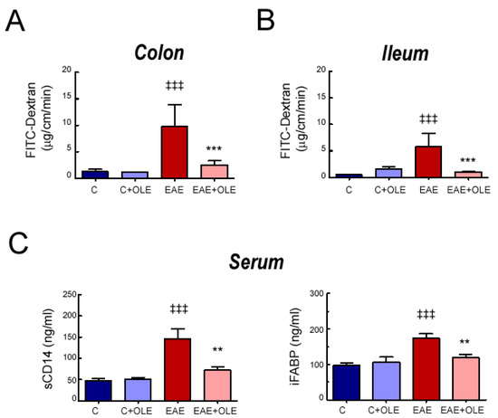 OLE treatment protects from intestinal permeability in EAE mice. Intestinal sacs prepared from colon (A) and Ileum (B) to assess intestinal permeability. Sacs were loaded with FITC-labeled Dextran (FD-40) and placed in a bath. After 120 min, the FD-40 concentration from the bath solutions was quantified. (C) Levels of soluble CD14 and iFABP in serum, quantified by ELISA. Results were expressed as the mean ± SEM, n = 5–7 per group. ‡‡‡ p < 0.001 vs. control; and ** p < 0.01 and *** p < 0.001 vs. untreated-EAE. C, healthy mice. C + OLE, healthy mice treated with OLE. EAE, induced mice. EAE + OLE, induced mice treated with OLE.