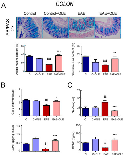 Next, AB-PAS staining was conducted to determine changes in mucins content in the colon of mice of the different experimental groups. As shown in Figure 3A, OLE treatment prevented the significant decrease in the overall AB/PAS staining detected in colon sections from untreated-EAE mice. Although we observed a significant reduction in the expression of both acidic and neutral mucins in colon of EAE mice, the ratio acidic/neutral mucin species between the healthy control and EAE mice kept constant at 2:1.