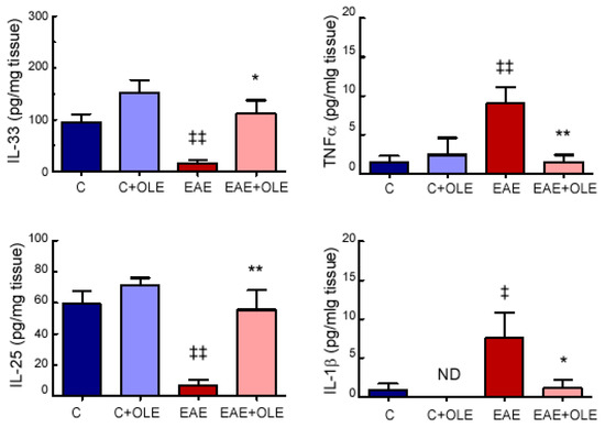 We also examined parameters of intestinal inflammation in the different experimental groups. We found that OLE significantly reduced the levels of the pro-inflammatory cytokines TNFα and IL-1β, which were observed up-regulated in colon tissue from EAE mice (Figure 4). Additionally, the expression levels of the two potent type-2 inducing cytokines IL-33 and IL-25 were down-regulated in colon from EAE mice, compared to healthy control mice; and OLE treatment protected against this decrease (Figure 4).