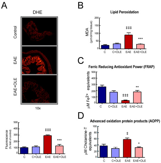 OLE treatment reduces oxidative stress in colon tissue from EAE mice. (A) Representative photomicrographs of colon tissue stained with DHE. Histological analysis by fluorescence microscopy and quantification. Objective lens 10×. Expression levels of malondialdehyde, MDA (B); advanced oxidized protein products, AOPP (C); and ferric reducing/antioxidant power, FRAP (D) in colon tissue. Results were expressed as the mean ± SEM, n = 4–7 per group. ‡ p < 0.05 and ‡‡‡ p < 0.001 vs. control; and * p < 0.05, ** p < 0.01 and *** p < 0.001 vs. untreated-EAE. C, healthy mice. C + OLE, healthy mice treated with OLE. EAE, induced mice. EAE + OLE, induced mice treated with OLE.