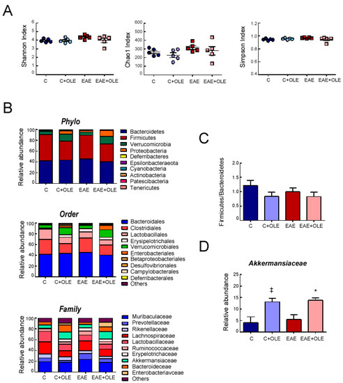 Effect of OLE treatment on intestinal microbiota of mice. (A) Alpha-diversity of the gut microbiota using Shannon, Simpson and Chao indices. (B) Bar chart regarding the distribution of the most abundant phyla, orders, and families. The proportion of stack in the bar chart corresponds to the total amount of reads of the most abundant phyla, orders and families. (C) Firmucutes/Bacteriodetes ratio (D) Relative abundance of Akkermansiaceae. Data are the mean ± SEM, n = 5 per group. ‡ p < 0.05 vs. control; and * p < 0.05 vs. untreated EAE. C, healthy mice. C + OLE, healthy mice treated with OLE. EAE, induced mice. EAE + OLE, induced mice treated with OLE.