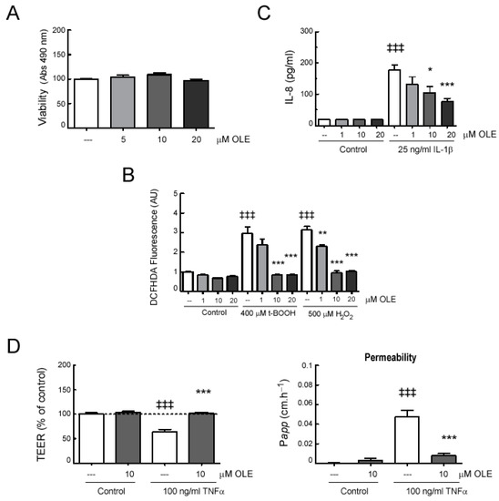 OLE treatment modulates responses of activated Caco-2 cell monolayers. (A) Caco-2 monolayers were treated for 24 h with the indicated doses of OLE and viability was measured as indicated in material and methods. Caco-2 monolayers, pretreated for 30 min with different doses of OLE, were incubated with the indicated stimuli: (B) After 1 h, cells were stained with DCFH-DA and intracellular ROS-production was analyzed in a microplate reader; (C) after 24 h, IL-8 concentration in the cell-culture supernatant was measured by commercial ELISA; and (D) after 24 h, trans-epithelial electrical resistance (TEER) was tested. TEER values at 24 h normalized to the untreated control (100%) and FITC-dextran (FD-40) transport. Assays were performed in duplicates, n = 3. Results were expressed as the mean ± SEM. ‡‡‡ p < 0.001 vs. control; and * p < 0.05 and ** p < 0.01 *** p < 0.001 vs. stimuli without OLE.