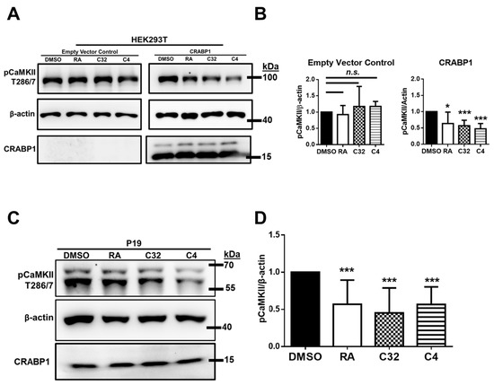 C32 and C4 dampen CaMKII activity in a CRABP1-dependent manner. (A,B) Western blot and quantification of pCaMKII activity, marked by pThr-286/7 (pCaMKII T286/7) in HEK293T cells treated with DMSO, atRA, C32, or C4 at 0.5–5 μM for 15 min. HEK293T cells were co-transfected with GFP-CaMKII and either empty vector control or CRABP1 expressing vector. Anti-CRABP1 was used to detect CRABP1 in empty vector and CRABP1 transfected samples. p = 0.03 (RA), 0.001 (C32), 0.001 (C4), determined by paired Student’s t-test (n = 4–7). (C,D) Western blot for detecting endogenous CaMKII activity, marked by pThr-286/7, in P19 cells treated with atRA, C32, or C4 at 0.5–5 μM for 15 min. Anti-CRABP1 was used to detect endogenous CRABP1. β-actin was used as a protein loading control. p < 0.0001 (atRA, C32, and C4) determined by paired Student’s t-test (n = 12–19). * p ≤ 0.05, *** p ≤ 0.001, “n.s.” not significant. Error bars are presented as mean ± SD.
