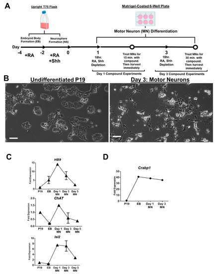 Figure 3A depicts the workflow for the new P19-MN differentiation system and the data demonstrating MN differentiation efficiency. First, P19 cells in a single-cell suspension were transferred into P19 Differentiation Medium containing 0.5 μM atRA (+RA Medium, see Section 4.6 for complete media formulations) in a T75 flask. The flask was stored up-right to prevent cells from attaching to the coated surface of the flask, allowing the cells to form embryoid bodies (EB) over a two-day period (Day −4 to Day −2). The EBs were then collected and resuspended in fresh P19 Differentiation Medium containing 0.5 μM atRA and 200 ng/mL mouse Sonic Hedgehog protein (Shh) (+RA, +Shh Medium) in a new T-75 flask for neurosphere (NS) formation over the next two-day period (Day −2 to Day 0). The flask was stored in the same manner to promote NS formation. Shh is a potent morphogen known to promote ESC differentiation into functional MNs [30]. On Day 0, the NSs were dissociated into single cells and then plated onto a Matrigel-coated 6-well plate for MN differentiation (Day 1 to Day 3). Cells were collected and analyzed at various time points for the expression of relevant markers of MNs.