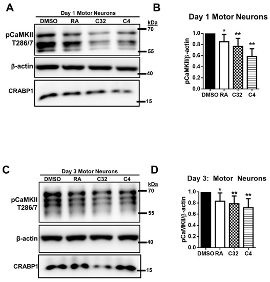 C32 and C4 dampen CaMKII activity in Day 1 and Day 3 P19-MN differentiation process. (A,B) Western blot of RA, C32, C4 effect and quantification on endogenous CaMKII activity marked by pThr 286/7 activity in Day 1 P19-differentiated MNs. Day 1 MNs were treated with 1uM atRA, C32, or C4 for 15 min and then harvested for western blot analyses. p = 0.02 (RA), p = 0.005 (C32), and p = 0.003 (C4) determined by paired Student’s t-test (n = 5–7). (C,D) Western blot and quantification of RA, C32, C4 effect on endogenous pCaMKII T286/7 activity in Day 3, P19-MNs. Day 3 MNs were treated with 1uM atRA, C32, or C4 for 30 min and then harvested for western blot analyses. Anti-CRABP1 was used to detect endogenous CRABP1. p= 0.04 (RA), p = 0.003 (C32), and p = 0.002 (C4) determined by paired Student’s t-test (n = 5–7). β-actin was used as a protein loading control. * p ≤ 0.05, ** p ≤ 0.01. Error bars are presented as mean ± SD.