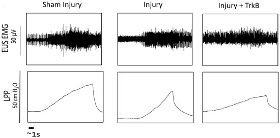 As performed previously, LPP was determined by subtracting baseline bladder pressure from peak bladder pressure during LPP testing [34]. Baseline pressure was defined as the bladder pressure just before the application of pressure, and peak pressure was the bladder pressure at which leakage occurred [36]. Analysis of LPP and EUS EMG signals was performed by sequestering 4–6 one-second segments for baseline and peak activity. The amplitude and firing rate of EUS EMG activity were determined as previously described [36]. In brief, a custom threshold for each baseline-peak pair was created to remove background noise. Methods were performed as previously described, using Matlab (V 2012b, Mathworks, Natick, MA, USA) [36]. The increases in amplitude and firing rate during LPP testing were determined by subtracting baseline from peak activity levels. The mean value for each animal for each quantitative variable was calculated and was used to calculate the mean and standard error for each experimental group. A Welsh one-way analysis of variance (ANOVA) with a Dunnett’s T3 post hoc test was used to compare LPP and EUS EMG outcomes between groups with the injury alone group as the control. p < 0.05 indicated a statistically significant difference between groups. Representative traces of the LPP pressure and corresponding EUS EMG trace were chosen based on means of both outcomes in each group (Figure 1).