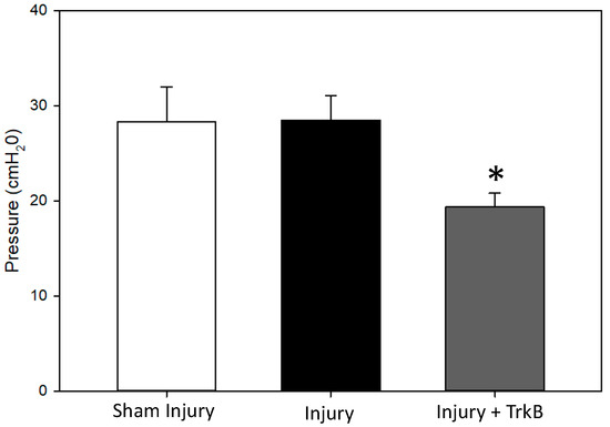 Leak-point pressure results. Leak-point pressure 6 weeks after sham injury treated with saline (Sham Injury); pudendal nerve crush (PNC) and vaginal distension (VD) injury treated with saline (Injury); or PNC + VD injury treated with tyrosine kinase B (TrkB) fusion chimera (Injury + TrkB). Each bar represents mean ± standard error of the data from 11–14 animals. There were 4–6 LPP tests per animal. A Welsh one-way analysis of variance (ANOVA) with a Dunnett’s T3 post hoc test was used to determine statistically significant differences (p < 0.05) compared to the Injury group. * indicates a statistically significant difference compared to the Injury group.