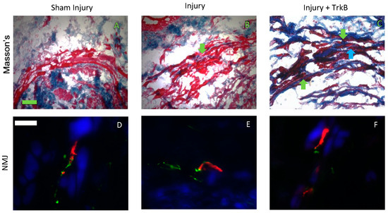 External urethral sphincter anatomy. Representative images of Masson’s stained urethral cross-sections 6 weeks after (A) sham dual injury treated with saline (Sham Injury); (B) pudendal nerve crush (PNC) and vaginal distension (VD) injury treated with saline (Injury); and (C) PNC + VD injury treated with tyrosine kinase B (TrkB) fusion-chimera (Injury + TrkB). Representative images of neuromuscular junction (NMJ) immunofluorescence 6 weeks after (D) sham injury, (E) injury, and (F) injury + TrkB. In Masson’s stained specimens (A–C), collagen was stained blue, and muscle cells were stained red. In immunofluorescence images (D–F), nerve axons are stained green, NMJs are stained red, and the muscle is stained blue. The green scale bar in panel (A) for Masson’s trichrome data is 100 µm. The white scale bar in panel (D) for immunofluorescence data is 20 µm. Green arrows indicate collagen, and the blue arrow indicates disrupted EUS.