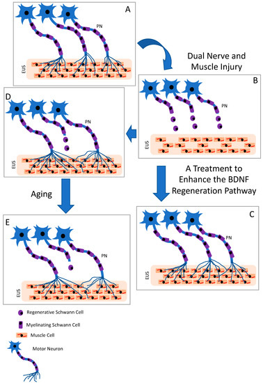 Summary diagram. A normal external urethral sphincter (EUS) is innervated by the motor neurons of the pudendal nerve (PN), as shown in (A). An injured EUS and PN has decreased innervation, as shown in (B). Treatments that enhance the BDNF regenerative pathway could enhance neuroregeneration of the PN and re-innervation of the EUS, as shown in (C). Unassisted regeneration of the PN results in increase in muscle fibers innervated by a single motor neuron, as shown in (D). With time after unassisted partial regeneration, axons atrophy with aging, as shown in (E).