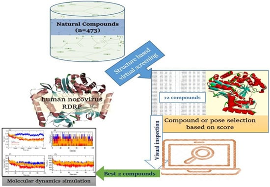 The employment of a rapid and lucrative process in the development of novel medication leads has forced the pharmaceutical sector to reconsider its research and development strategy. A computer-assisted drug design technique that makes extensive use of computing power has emerged as one of the most efficient methods of searching for novel lead molecules [11,12,13]. Various computational tools have been developed and used during the last two decades to assist researchers in saving time and cost. These methods involve discovering lead compounds by virtual screening (VS) and computational simulations, as well as chemical and biological data on ligands and molecular targets of possible leads [14,15,16]. The combination of these techniques makes it simpler to reject compounds with attributes outside of ideal ranges and identify viable compounds for optimization [17,18,19,20]. Here, we used high-throughput VS and molecular dynamics studies to identify new natural leads that target the RdRp active sites and could be employed to combat HNoV. The flow diagram representation of this study is illustrated in Figure 1.