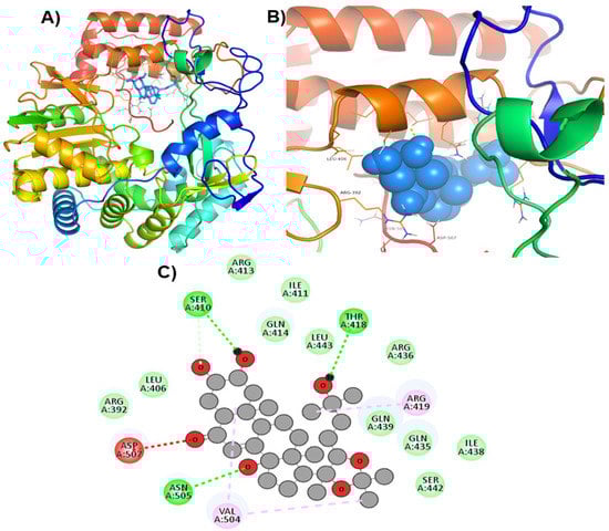 Visualization of ZINC69481850 in RdRp’s active site. 3D views of whole protein and ligand interactions (A), 3D views of interacting residues of the RdRp active site with ZINC69481850 (B), and 2D views of the RdRp residue interacting with ZINC69481850 (C).